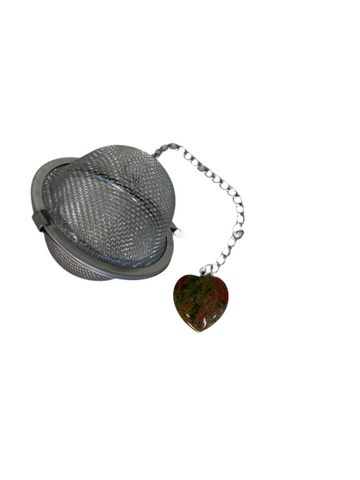 Stainless Steel tea infuser, with chain and heart crystal, used as re-usable alternative to tea bags.
