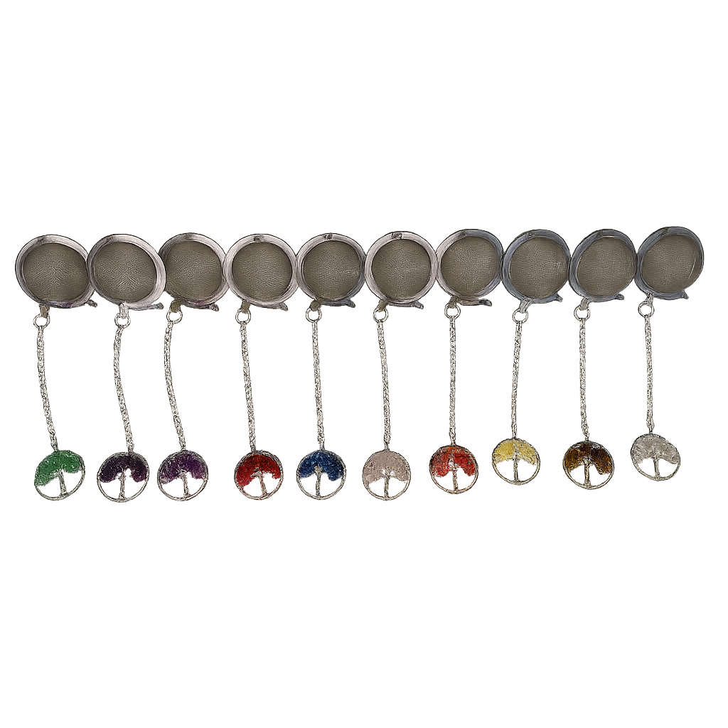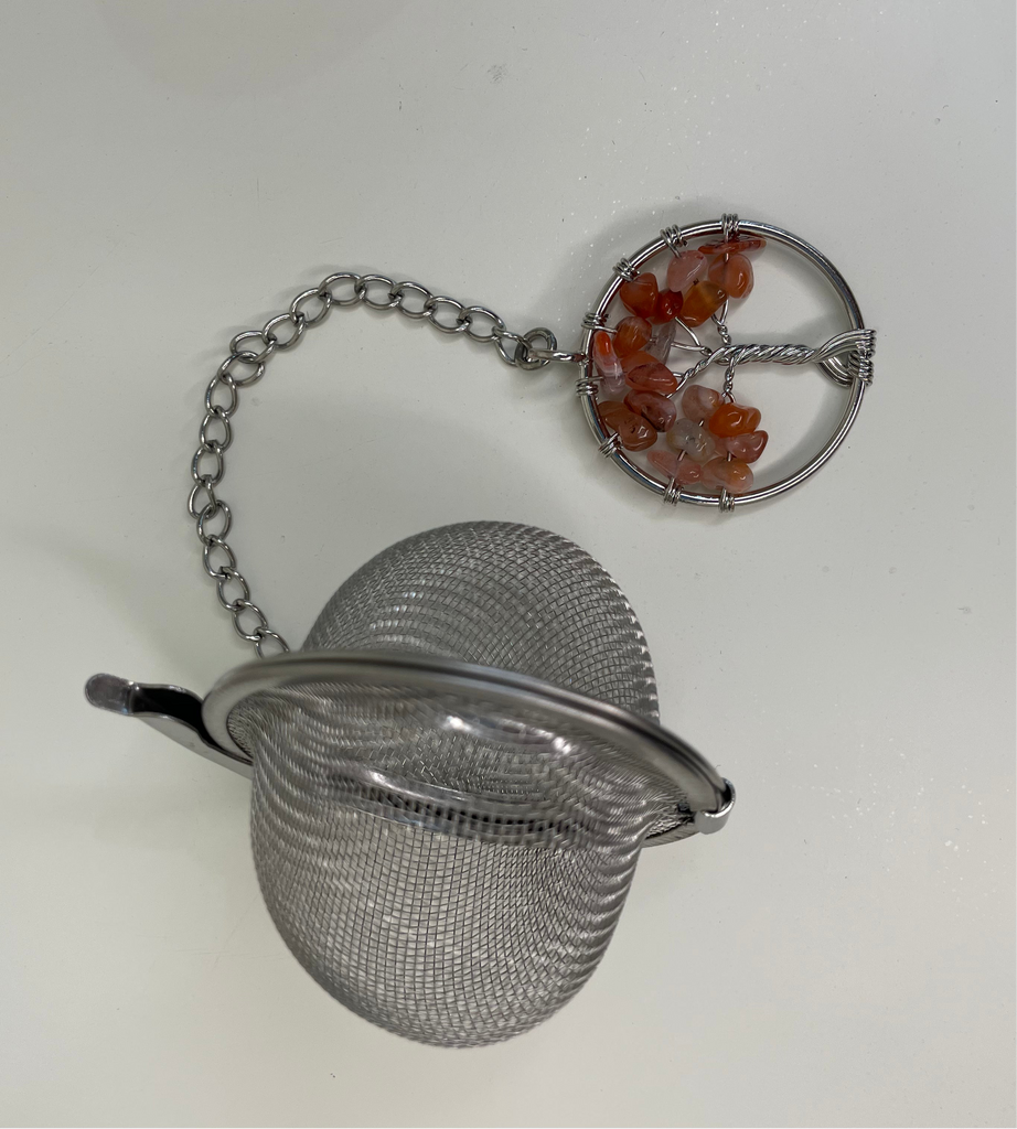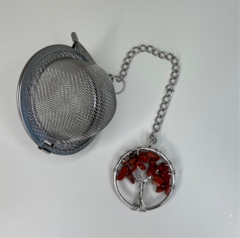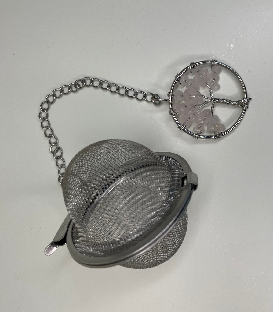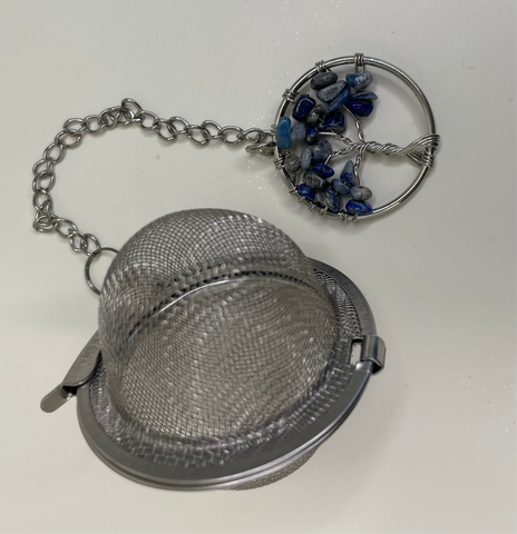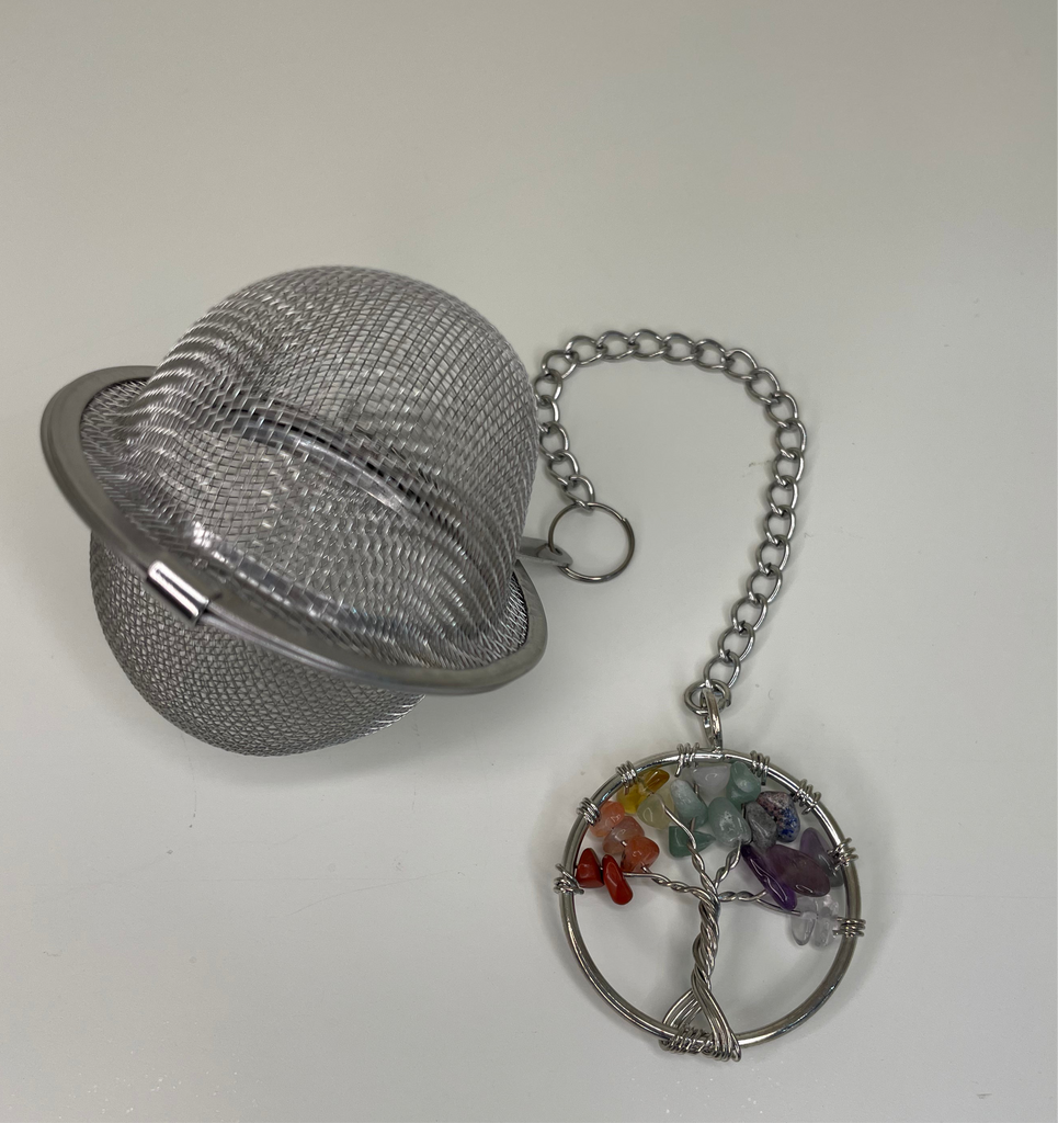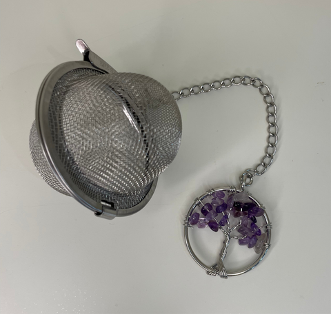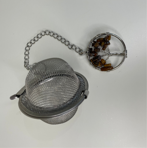 Stainless Steel tea infuser, with chain and crystal, used as re-usable alternative to tea bags.